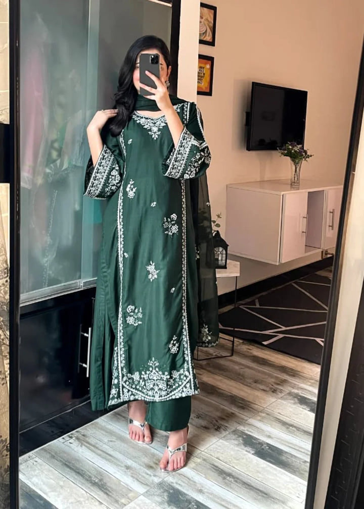 Indulge in the luxury of our Grace Embroidered 3PC, featuring intricate embroidery work on premium Linen fabric. This outfit includes an embroidered shirt, plain plazo, and embroidered Chiffon dupatta. Order now and experience the elegance of Grace Embroidered 3PC!